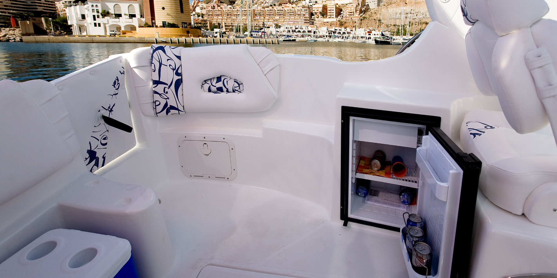 Esta embarcación ofrece un interior amplio y confortable, con dos estancias: asiento convertible en cama en proa y cama doble en popa, ideales para hasta 4 personas. Incluye baño y cocina completos para una experiencia de navegación cómoda y funcional.